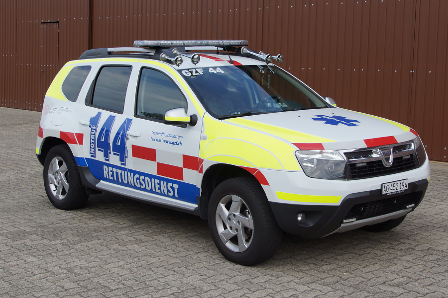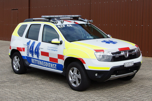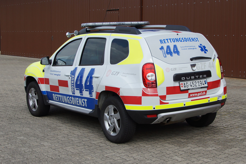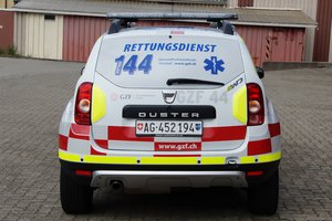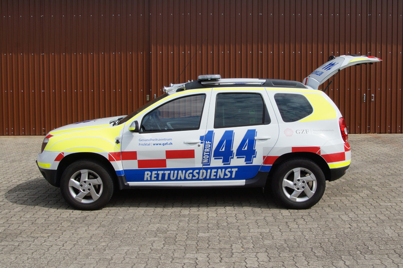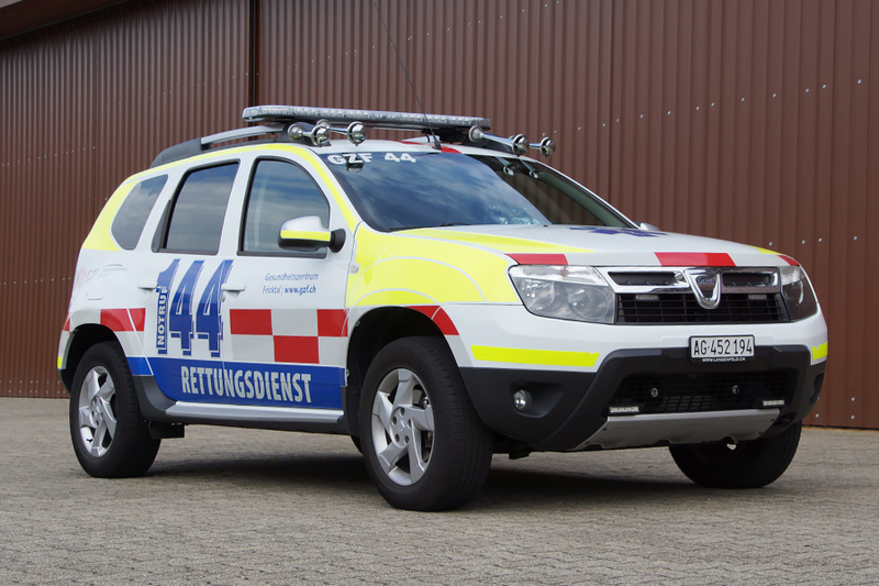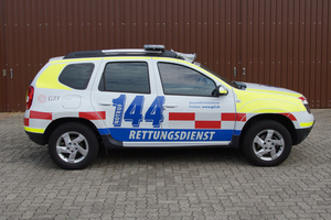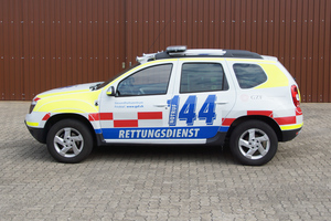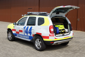 Dacia Duster mit Allradantrieb. Zusätzlich zu seiner Aufgabe als Zubringer für den Anästhesiepfleger wird der Dacia auch noch als Fahrzeug für den Einsatzleiter bei rettungsdienstlichen