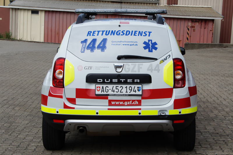 Als Fahrgestell dient dem Notfall-Einsatzfahrzeug des GZF ein Dacia Duster 110 dCi 4x4, also mit der Topmotorisierung für dieses Modell von 110 PS, mit Allradantrieb und Schaltgetriebe. Der Innenausbau eines unbekannten Herstellers besteht weitgehend aus Holz und nimmt den kompletten Fond und den Gepäckraum ein. Statt die Rücksitzbank für den Innenausbau ganz oder zumindest teilweise zu demontieren, wie in vergleichbaren Fahrzeugen häufig anzutreffen, wurde beim Fahrzeug des GZF die Rücksitzbank nur umgelegt und der Ausbau darauf montiert. Auf der linken Seite befindet sich im Fond ein bis unter die Decke reichender Schrank mit vier Schubladen für Kleinteile. Auf der rechten Seite befindet sich eine einfache Ablage mit Schienen zur Ladungssicherung, auf der eine Lucas-Reanimationshilfe mitgeführt wird. Vom Gepäckraum ist ein Regal zugänglich in dem die großen Ausrüstungsgegenstände wie das LifePak-EKG und der Notfallrucksack mitgeführt wird.